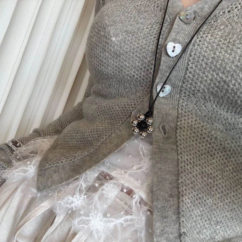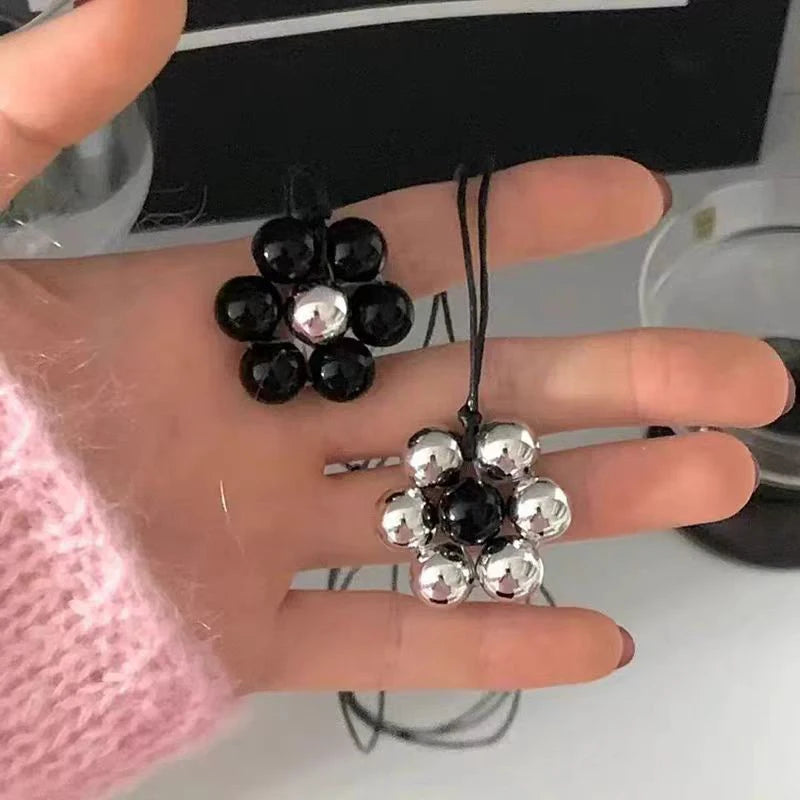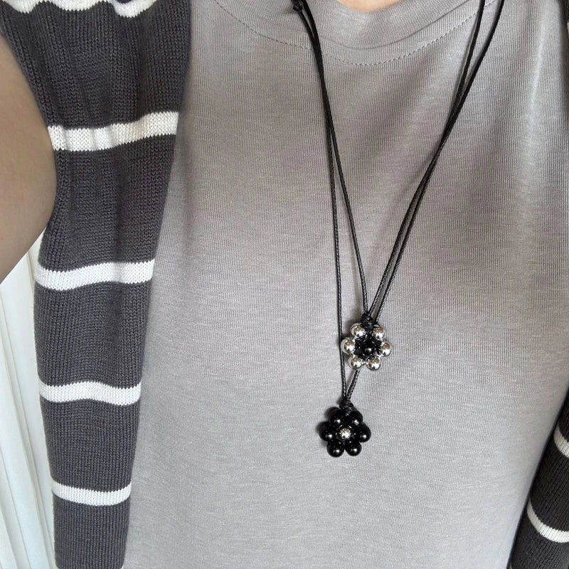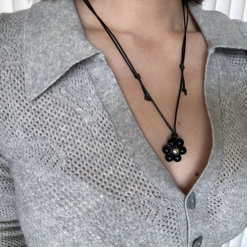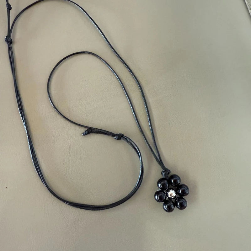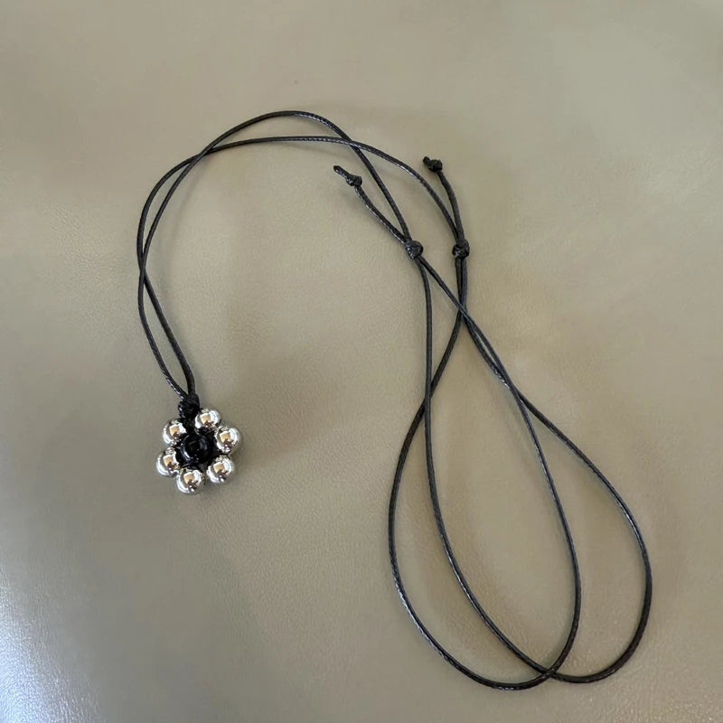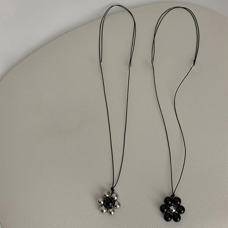 Elegant Metal Bead Flower Pendant Necklace for Women Black Flower Nylon Rope Clavicle Chain Minimalism Adjustable Sweater Chain