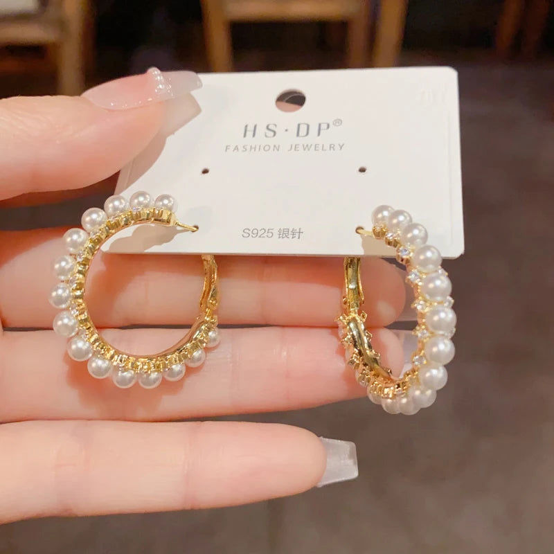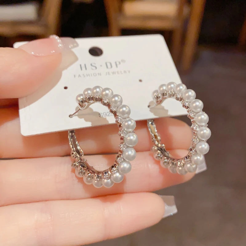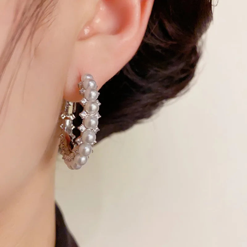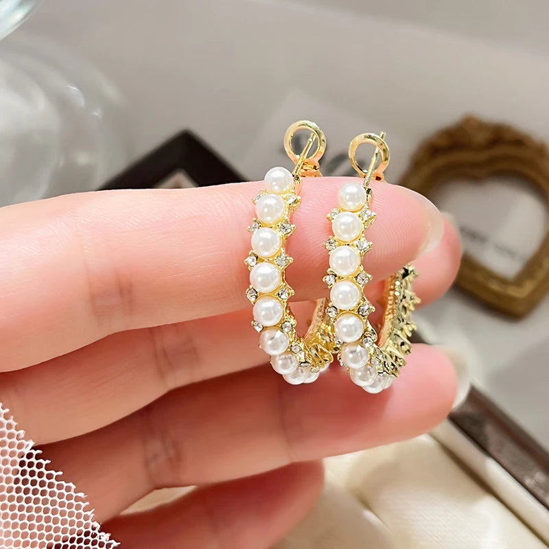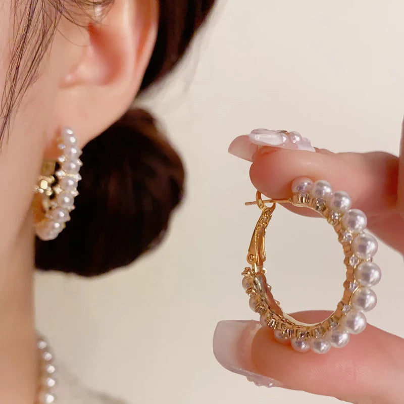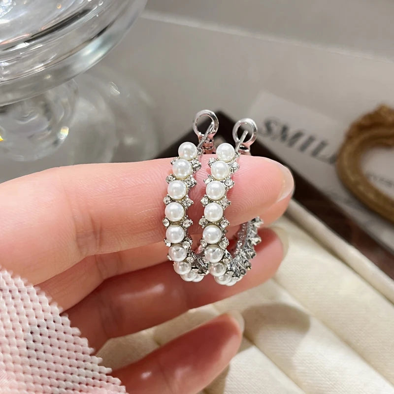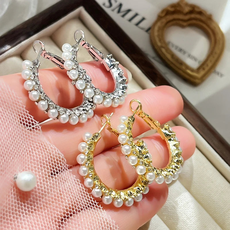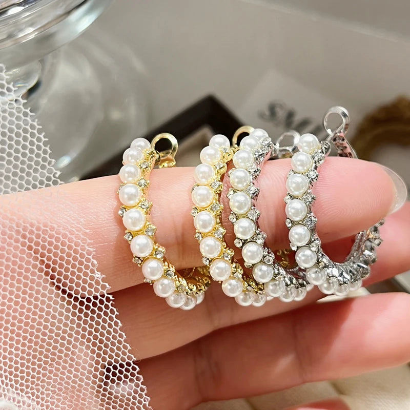 Korean Imitation Pearl Hoop Earrings for Women Temperament Metal Large Circle Rhinestone Earring Fashion Date Party Jewelry Gift